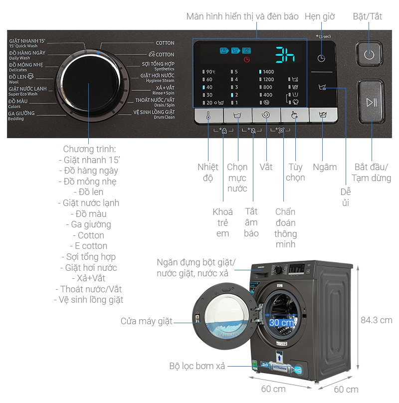 Bảng điều khiển trên máy giặt được thiết kế dạng núm xoay, có màn hình hiển thị rõ ràng hỗ trợ cả tiếng Anh lẫn tiếng Việt giúp người dùng dễ thao tác, sử dụng. Bao gồm 14 chương trình hoạt động khác nhau như: giặt nhanh 15 phút, giặt hơi nước, đồ len, giặt nước lạnh, giặt hằng ngày, vệ sinh lồng giặt…(Xem thêm chi tiết tại bảng TSKT). Trong đó, chế độ vắt sẽ giúp quần áo nhanh khô hơn, tiết kiệm đáng kể thời gian phơi quần áo.